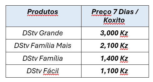 A DStv Angola anuncia o lançamento do seu novo produto de subscrição, denominado Koxito. O Koxito é o produto de subscrição da DStv por sete dias que vem em resposta a demanda dos clientes por opções mais acessíveis e com diferentes possibilidades de escolha.
